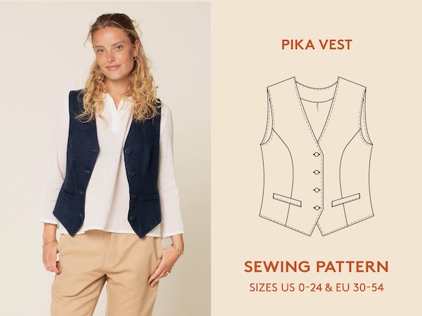 The front hem is pointed and slightly longer than the back, with decorative (non-functional) welts, princess seams, back darts, and a shaped back seam. The inside has lining and facings. Make the Pika vest with woven fabric. | | |