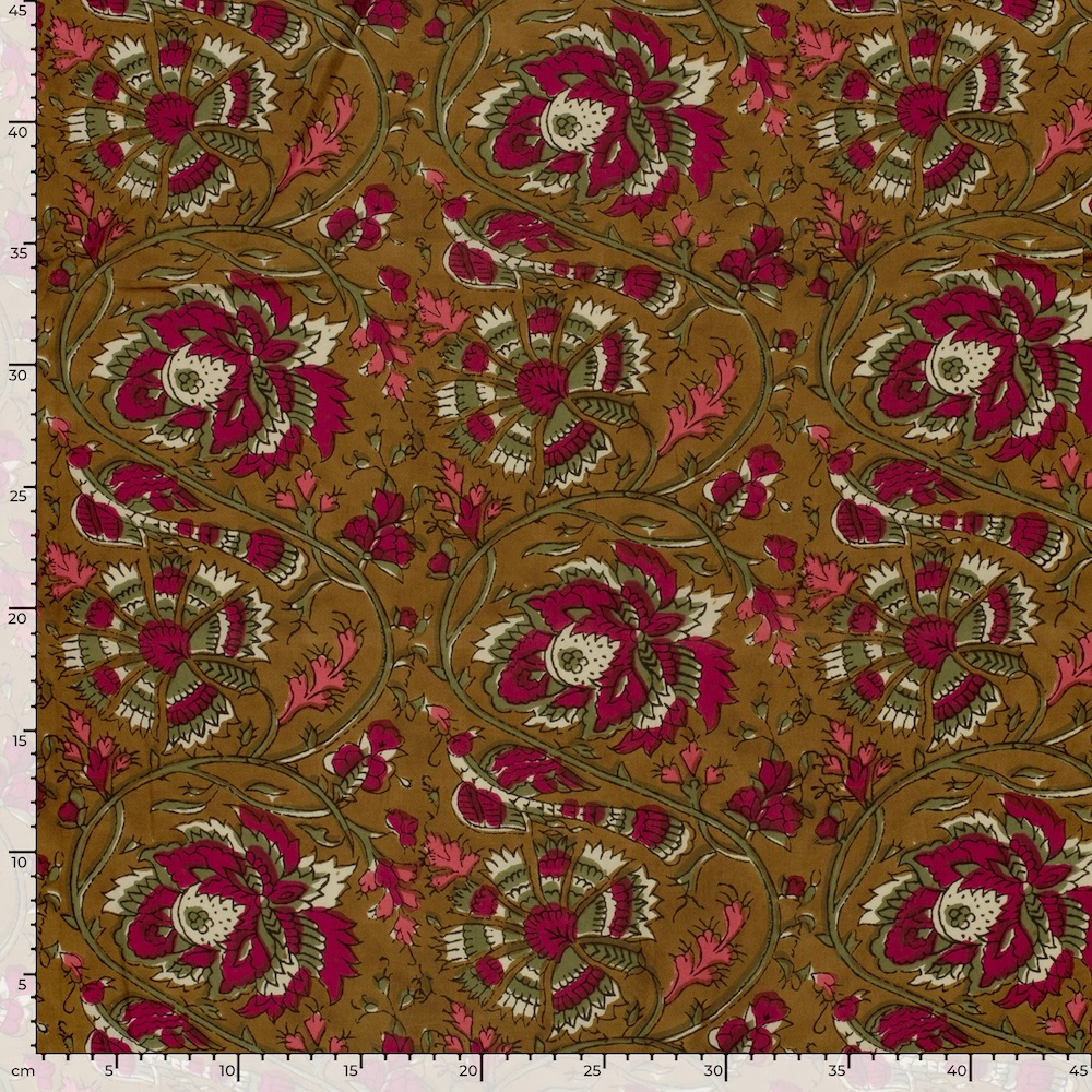 Wine On Olive Floral Indian Block Print In Cotton By Modelo Fabrics